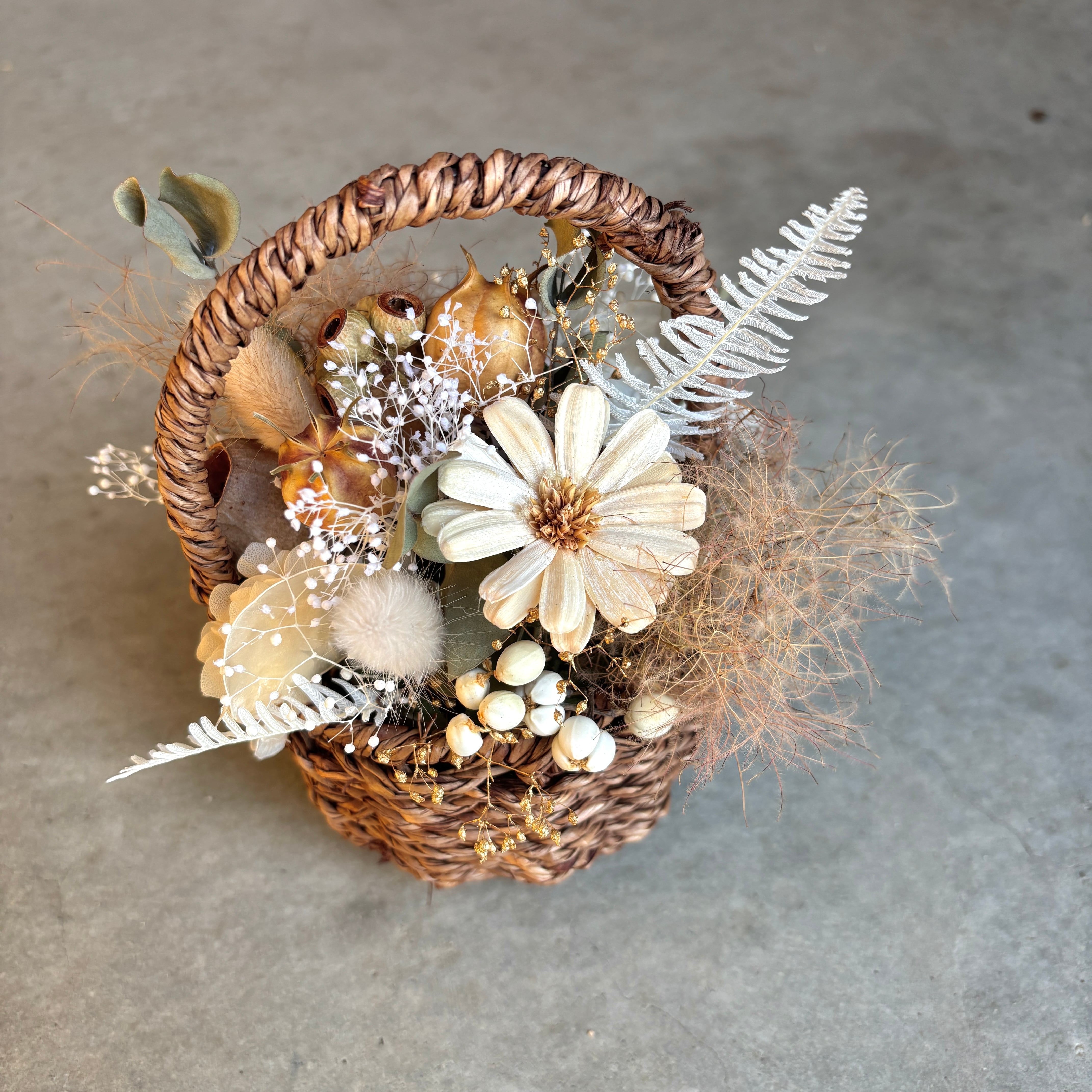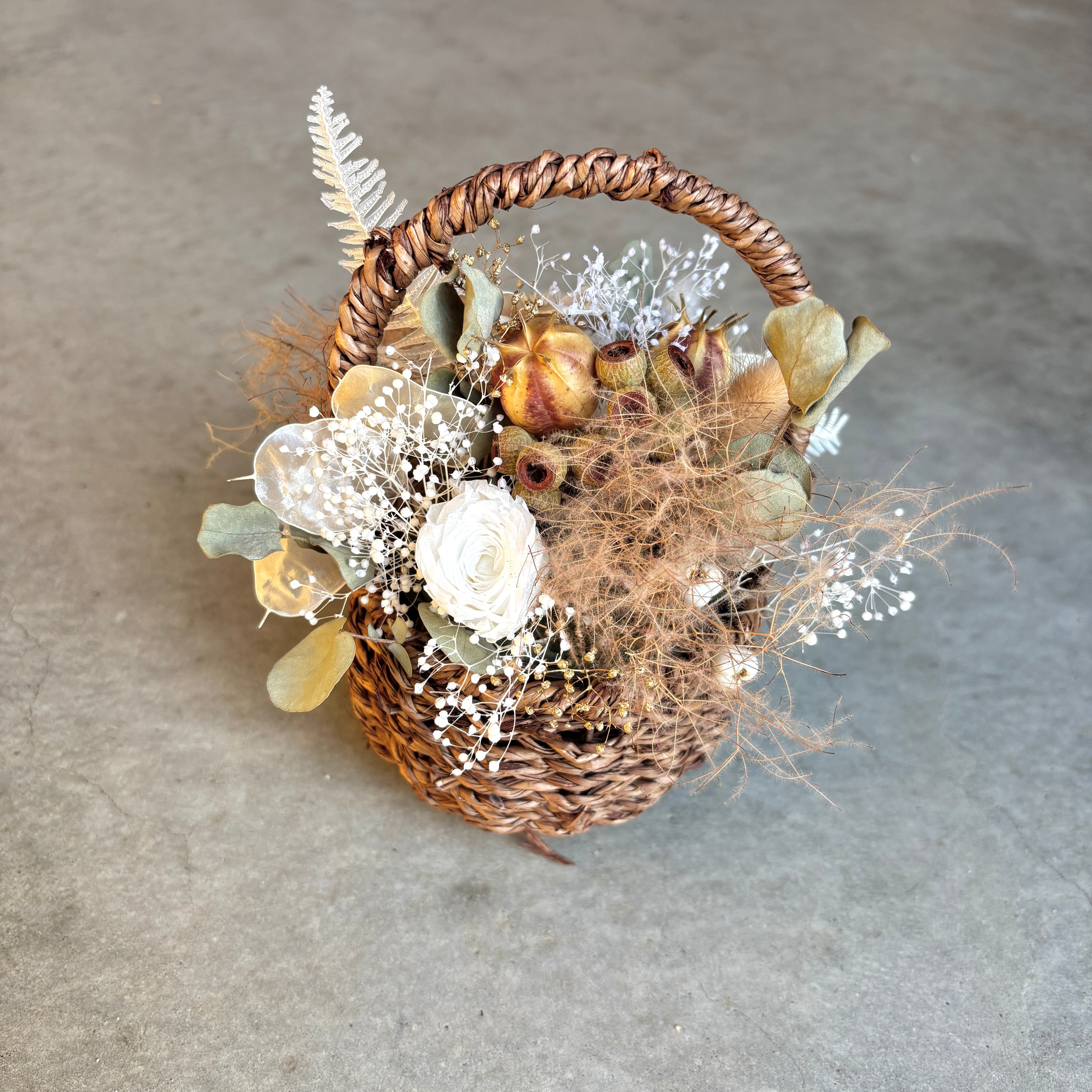 ナチュラルドライフラワーのカゴアレンジメント*くすみホワイト×ブラウン