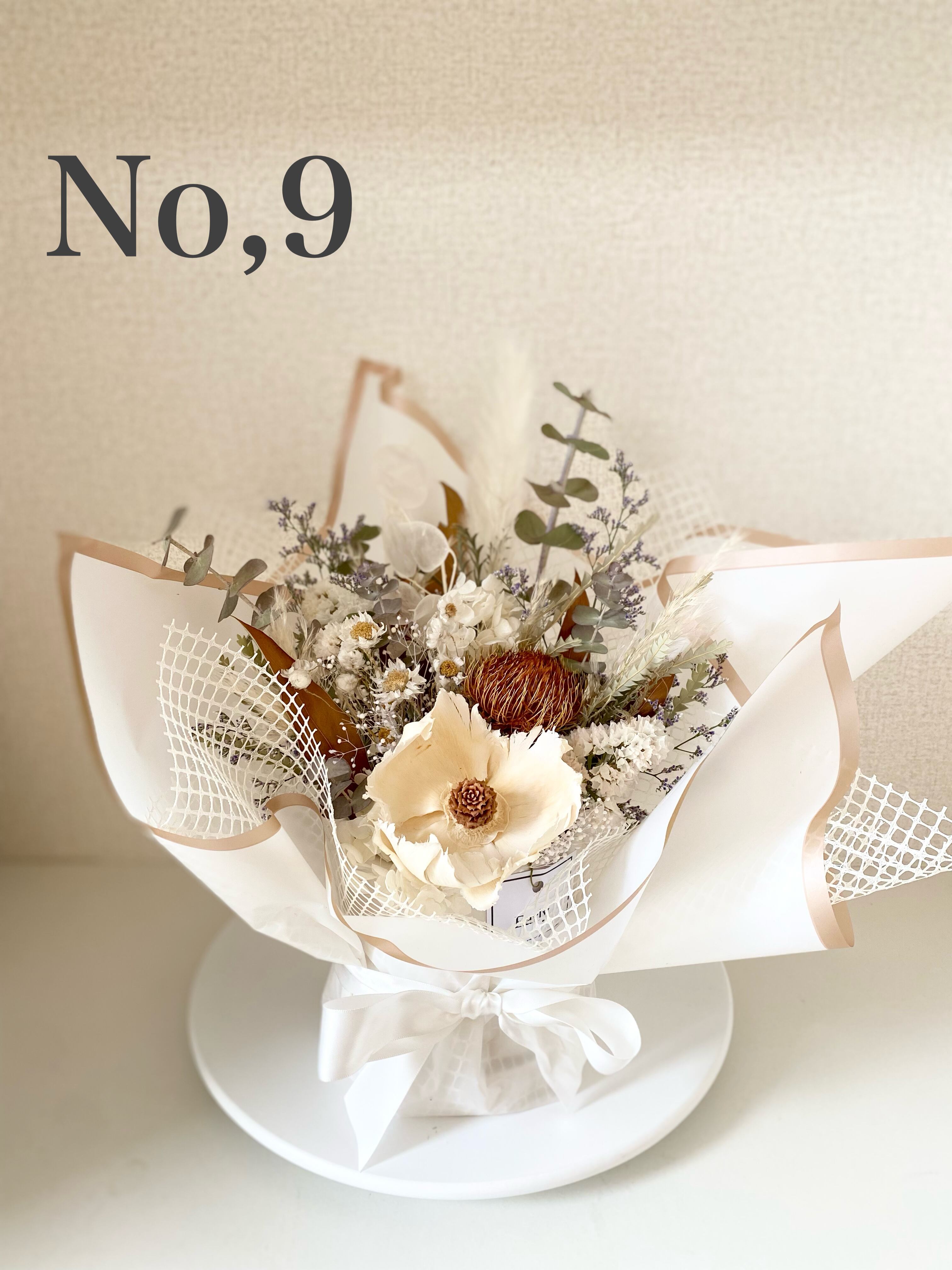 可憐な花々を集めた、天然素材のアレンジメントNo,9です。ほんのりと香る芳しい匂い、優雅で美しい風景、すべてが気持ちを穏やかにしてくれます。