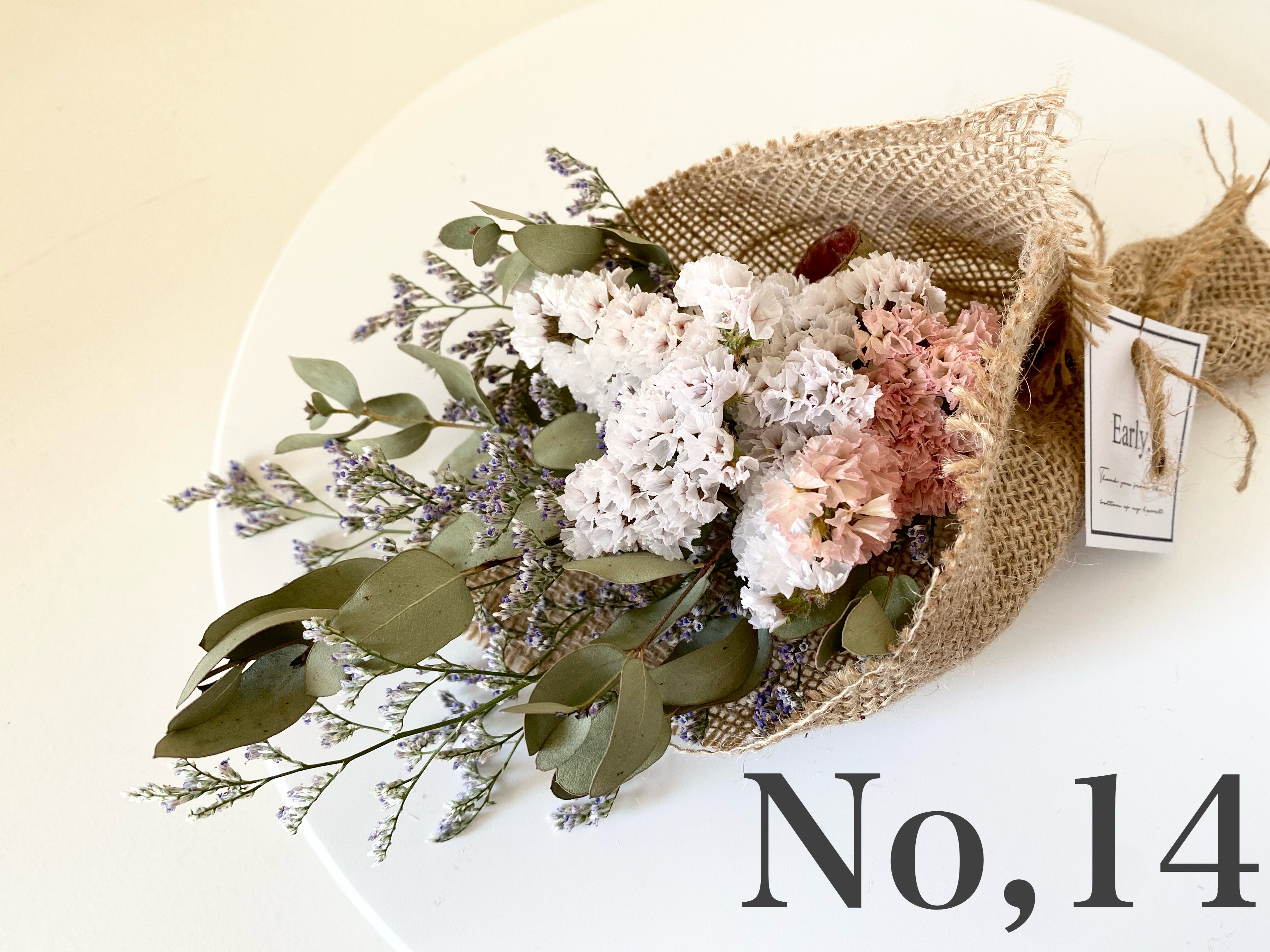 可憐な花々を集めた、天然素材のアレンジメントNo,14です。ほんのりと香る芳しい匂い、優雅で美しい風景、すべてが気持ちを穏やかにしてくれます。